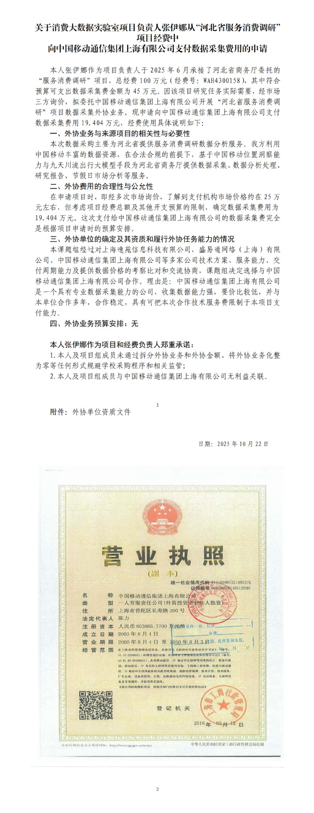 关于消费大数据实验室项目负责人张伊娜从“河北省服务消费调研”项目经费中向中国移动通信集团上海有限公司支付数据采集费用的申请